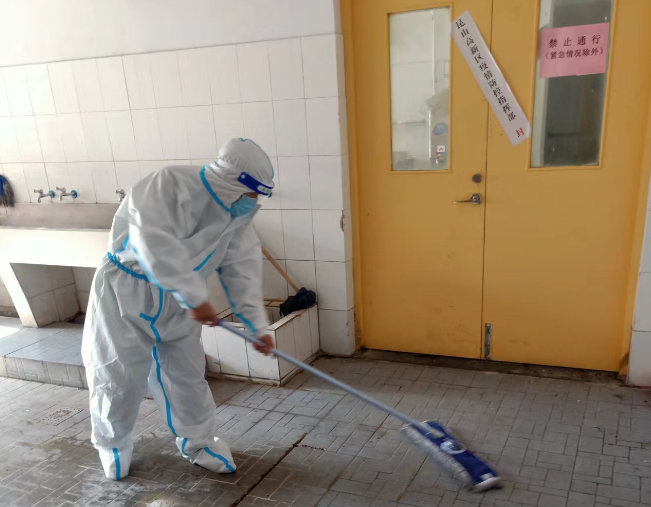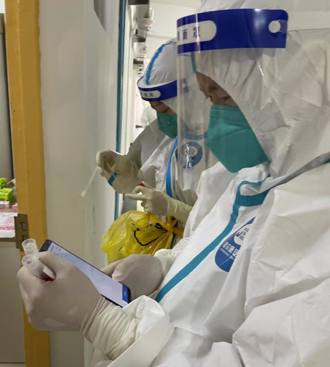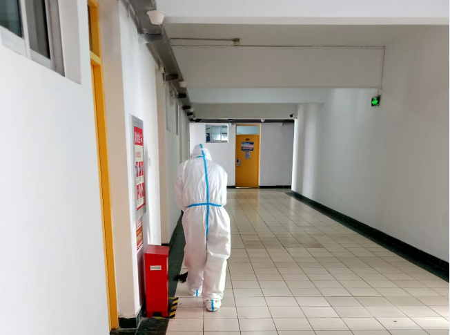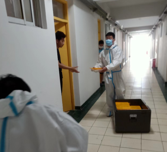 分發完餐食,稍作等待,即要開始一天的“必須課”——核酸檢測。由于社會面的輪番核酸,專業的醫護資源本就吃緊,面對封控區的特殊環境和人手不足的情況,我們這些志愿者們又站了出來,經過統一培訓,在醫護人員的考核之后,擔負起給整個宿舍區做核酸檢測的重任。從信息錄入到核酸采集,一絲一毫,不敢懈怠,統一收集完畢后,又開始忙里忙外的給宿舍清潔消殺,確保環境的健康。汗水打濕了他們的鬢角,模糊了護目鏡后的視線,但是,我們的勇士仍然義無反顧。